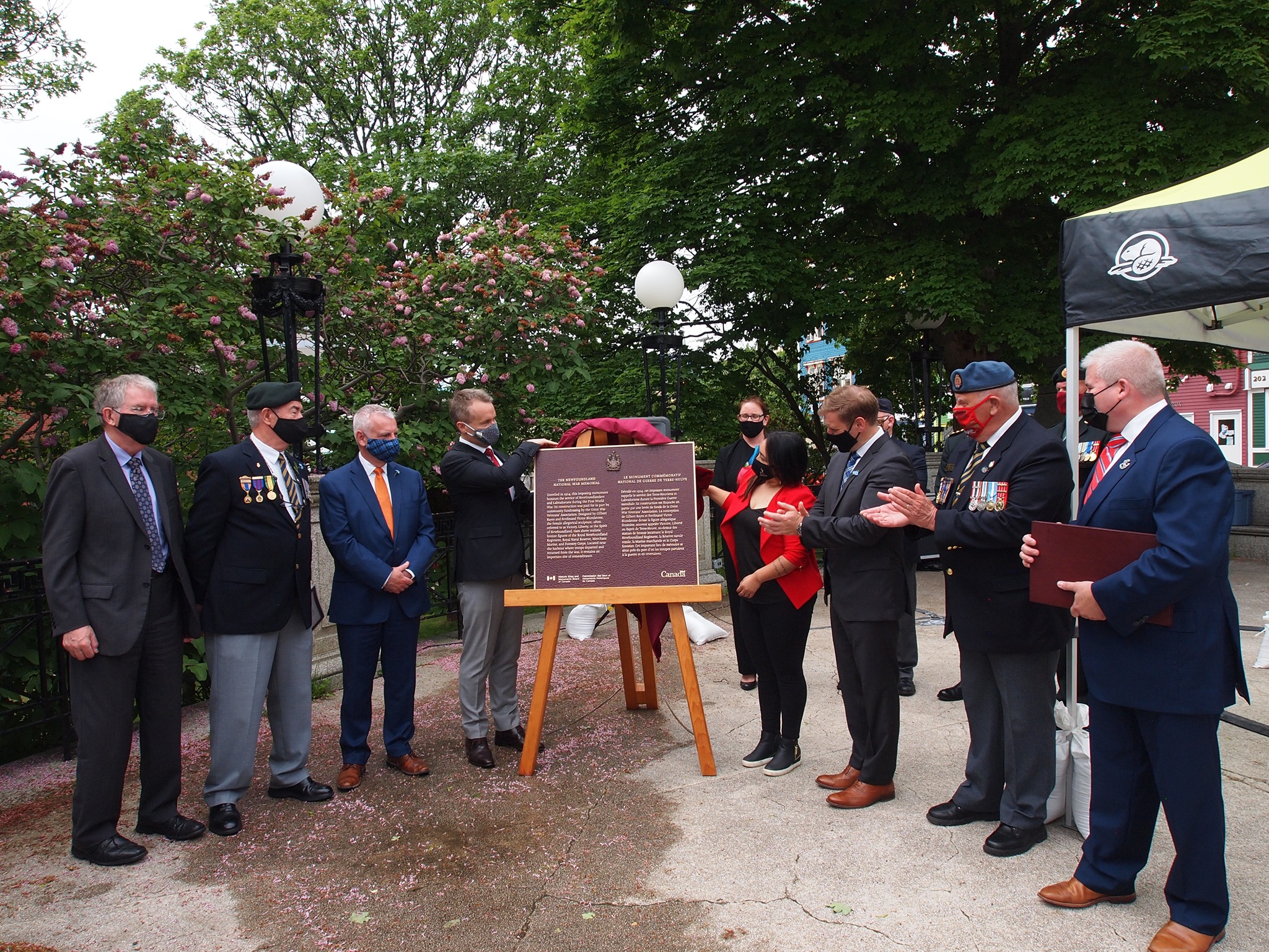From left to right: Jack Harris, MP for St. John's East; Gary Browne, plaque proponent; Danny Breen, Mayor of the City of St. John’s; Seamus O’Regan, Minister of Natural Resources and MP for St. John's South - Mount Pearl; Dr. Shannon Lewis-Simpson, NL Representative for Historic Sites and Monuments Board of Canada; Susan Onalik, Ordinary Member in the Constituency of Canada Nunatsiavut Assembly; Andrew Furey, Premier of Newfoundland and Labrador; Nathan Lehr, President, Royal Canadian Legion Newfoundland and Labrador Command; Dr. John Fitzgerald, plaque proponent.