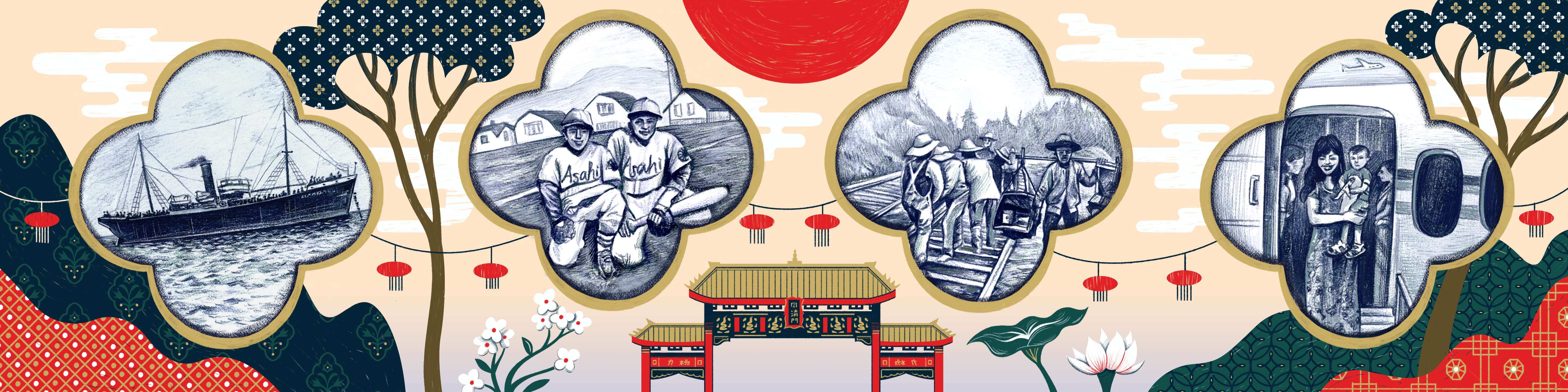 To accompany the Asian Heritage in Canada webpage and the national historic designations connected to this history, Parks Canada commissioned artwork by Emily Chu Illustration Ltd (see image above). This banner was created to highlight the diversity, resilience, and history of Asian Canadians. Emily Chu's description of the imagery and symbolism in this artwork are below.