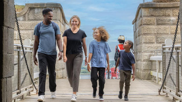 [Two kids run up the fort stairs to the ramparts while an adult walks up behind them.]