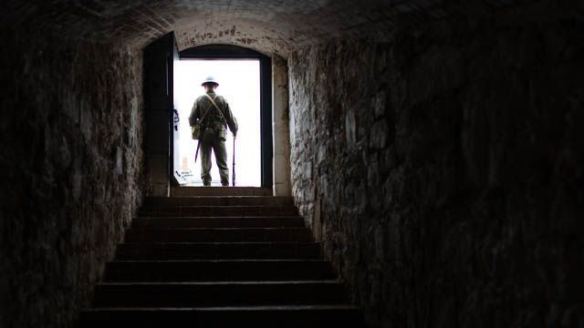 [Visitors follow the 78th Highlander as he guides them through the Halifax Citadel fort entrance.]