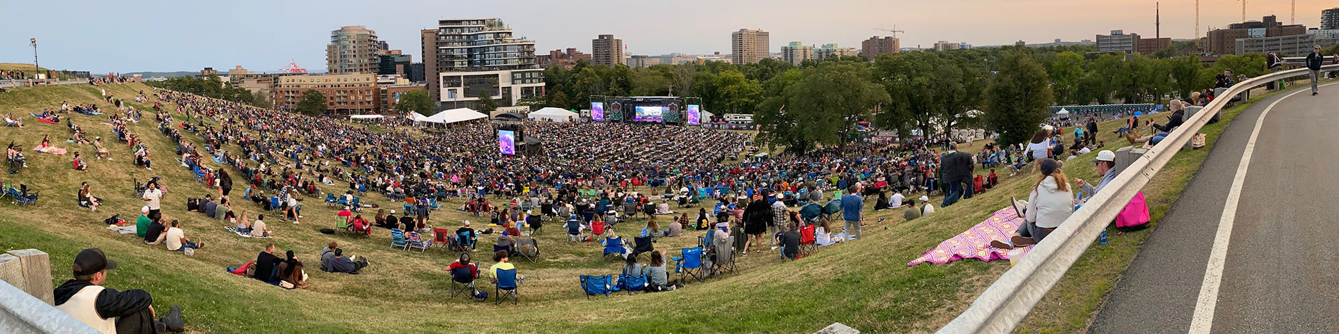 [View of Halifax Commons from Halifax Citadel, wide view of Parade Square, crowed entering the Citadel with Highlanders in foreground. A Quintet plays for a crowd and Highlanders fire rifles.]