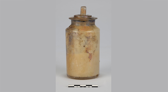The bottle contains its original contents, which will be sampled for further analysis. Similar bottles and vials recovered from Erebus were used to store various contents, mostly of a medicinal nature.