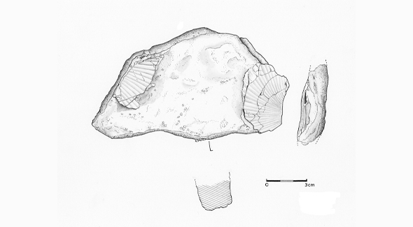 Preliminary analysis by the Geological Survey of Canada (GSC) indicates that the fossil matrix is a crinoidal/echinoid pack-stone to grainstone, a type of limestone characterized by an abundance of marine invertebrate fragments. Portions of two bivalve or brachiopod shells are visible at opposite ends. Parks Canada and the GSC are working together to attempt to determine the geographic provenance of this and other geological samples which could shed light on the expedition’s route and activities.
