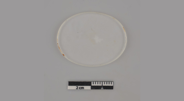 The oval shape and colourless glass of the lens suggest it comes from a pair of spectacles used for correcting vision, rather than a scientific instrument or a pair of snow goggles. Several pairs of spectacles and spectacle lenses from the Franklin Expedition were retrieved from King William Island by 19th-century search expeditions (https://www.rmg.co.uk/collections/objects/rmgc-object-2177)