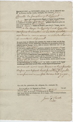 Contracts were an everyday occurrence within the fur trade, and each company had its own version of roughly the same document, which included destinations, job requirements, and pay. Some even specified what type of transportation the voyageur would be taking to and from their destination, either a canoe or bateau. Naturally, the details varied from contract to contract, but the idea was the same. Most of the 2,000 or so contracts that mention Fort St. Joseph are from the Michilimackinac Company, a Montréal-based operation. Within the Michilimackinac contracts, the notary and representative, often listed as Louis Chaboillez and Toussaint Pothier respectively, were stationed in Montréal. These agents handled new contracts and contracts for returning voyageurs.