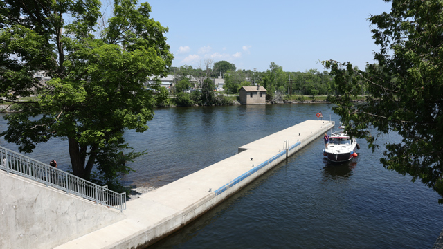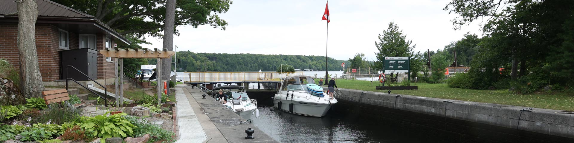 The painted blue strip (blue line) above and below each lock is a temporary holding area for boaters wanting to lock through. Tie up at this blue line only if you wish passage through the lock. To avoid the risk of injury: step slowly, do not jump, from the boat to the dock/wall and only after the boat has stopped. Be cautious of uneven surfaces or ‘sink holes’ along the canal walls.