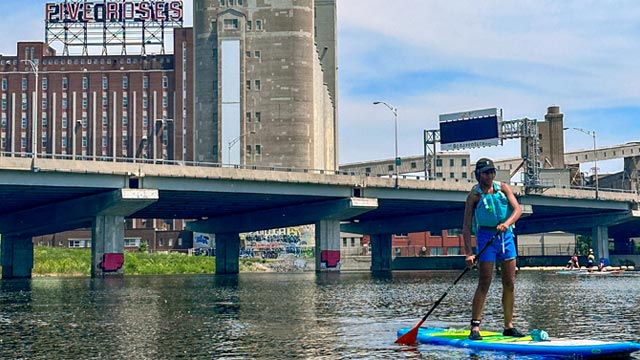 Paddleboarding (SUP) is permitted in reach No. 2 (1.7 km), reach No. 3 (2.9 km) and reach No. 4 (7.3 km) of the Lachine Canal. Check out our "Paddleboarding Safety" page, and make sure you have the right equipment to have fun safely. Users must use the available boat ramps.