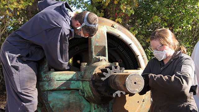 - Surface cleaning: Oil and grease deposits were removed to reveal the original finishes and expose areas affected by corrosion, using non-corrosive abrasive pads and stainless steel brushes.