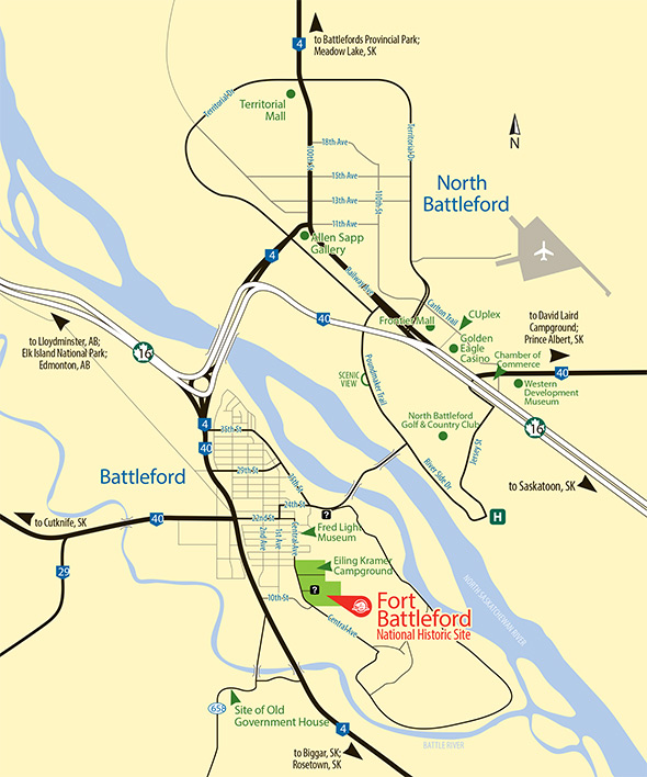 Fort Battleford National Historic Site is located 153 km northwest of Saskatoon in the town of Battleford, 4.8 km southeast of North Battleford.