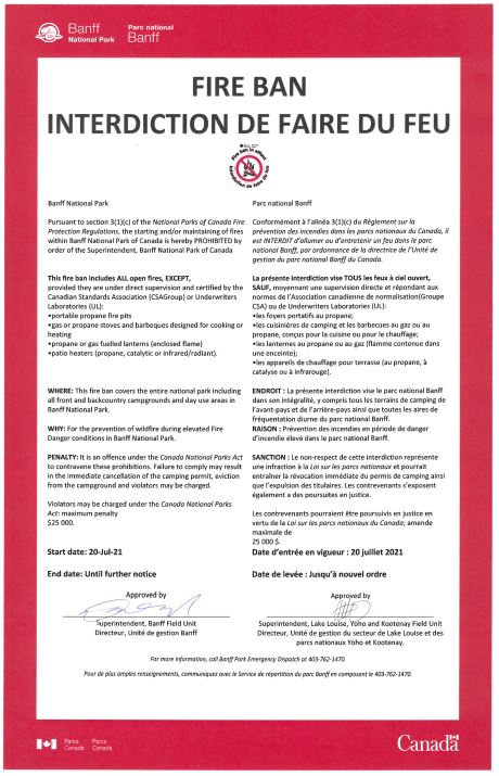 Pursuant to section 3(1)(c) of the National Parks of Canada Fire Protection Regulations, the starting and/or maintaining of fires within Banff National Park of Canada is hereby PROHIBITED by order of the Superintendent, Banff National Park of Canada