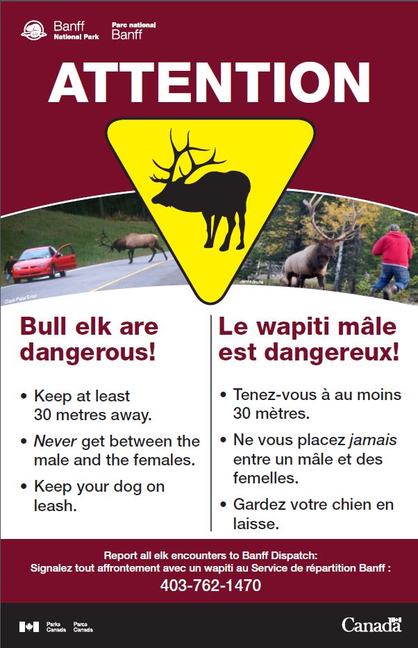 • Raise your arms or any big object (jacket or umbrella) to make yourself appear larger, maintain eye contact, and never turn your back or run. Climb a tree or keep an object, like a tree or large rock, between you and the elk. Back slowly out of the area. Warn other hikers of an elk ahead and report the incident immediately to Parks Canada dispatch at 403-762-1470.