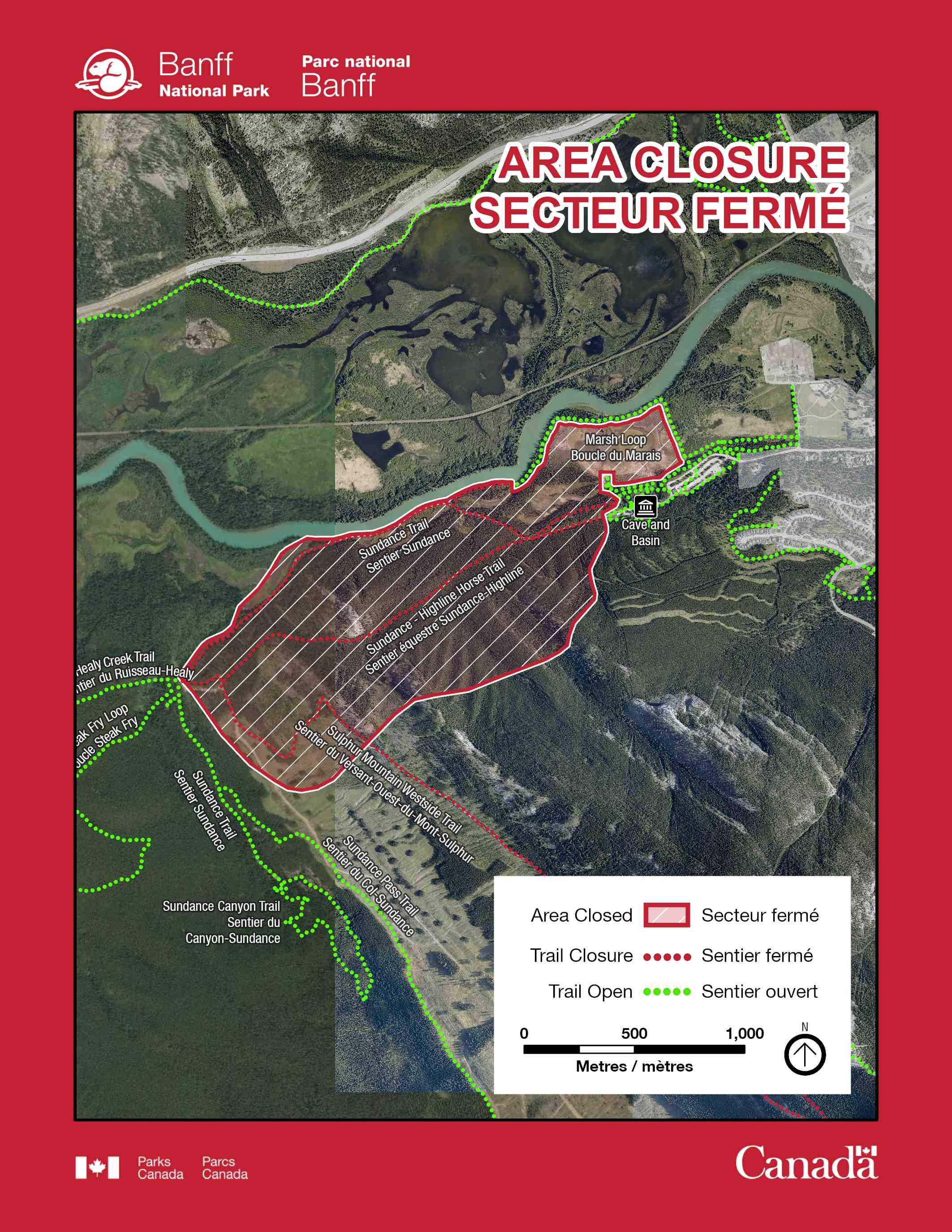 WHERE: The area between Cave and Basin and the Bow River extending west and ending at the Sundance / Healy Creek Trail Junction. Closed trails include Sundance Trail, Sundance-Highline Horse Trail, Sulphur Mountain Westside Trail, and a portion of the Marsh Loop.