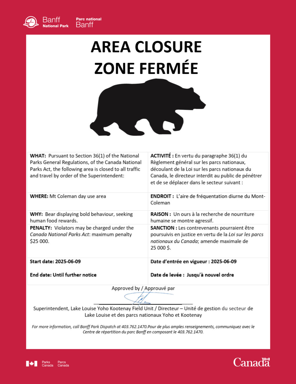 Area Closure - Mt Coleman day use area