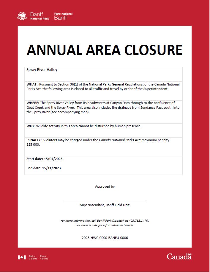 ANNUAL AREA CLOSURE: Upper Spray Valley