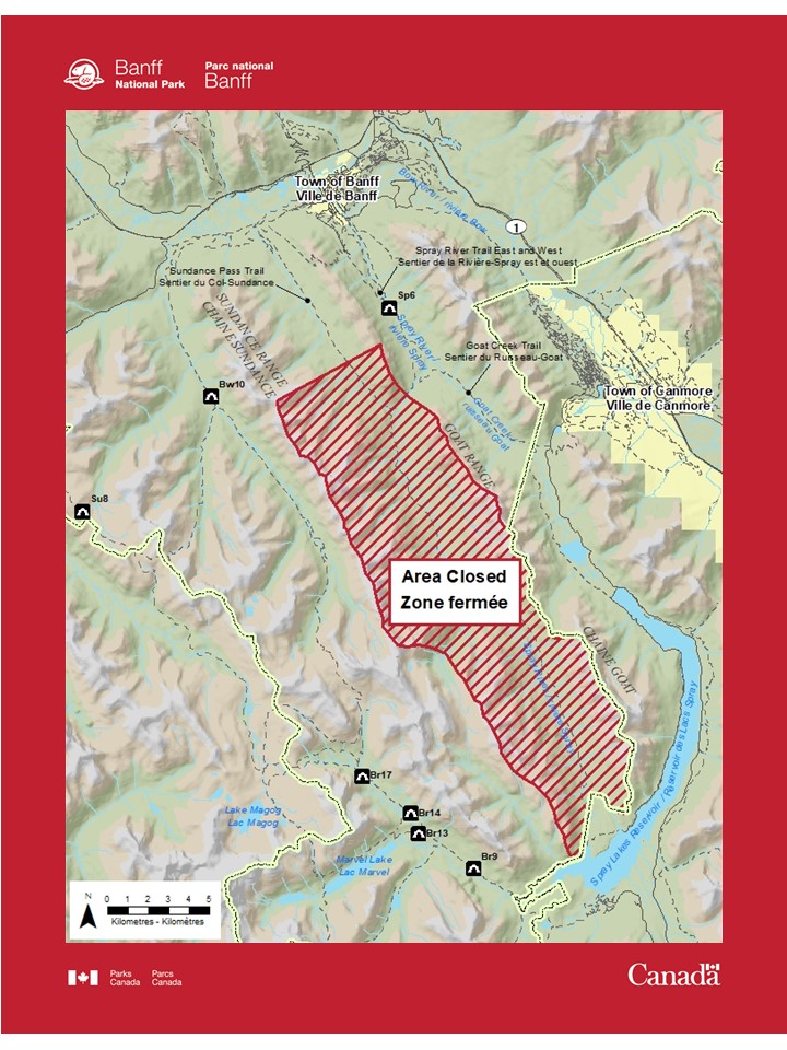 WHERE: The Spray River Valley from its headwaters at Canyon Dam through to the confluence of Goat Creek and the Spray River. This area also includes the drainage from Sundance Pass south into the Spray River (see accompanying map).