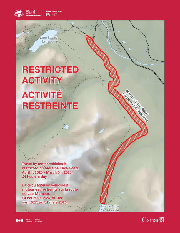 Travel by motor vehicles is restricted on Moraine Lake Road.