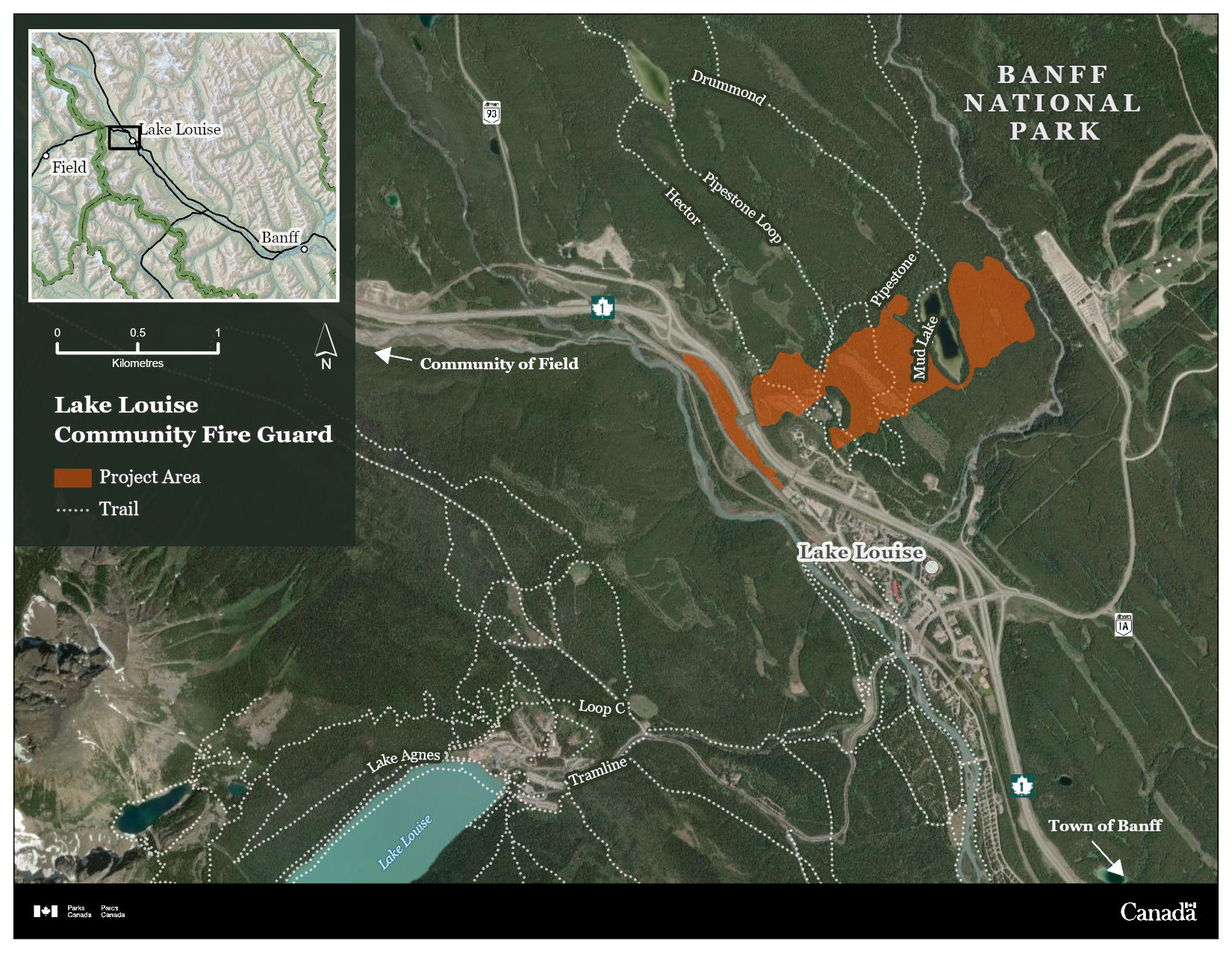 Area closures:For safety, area closures will be in place during operations. During closures, public access to the project area is strictly prohibited. The community of Lake Louise and seasonal facilities will remain open. However, the Pipestone parking lot and the Pipestone trail network will be impacted. An area closure will include: