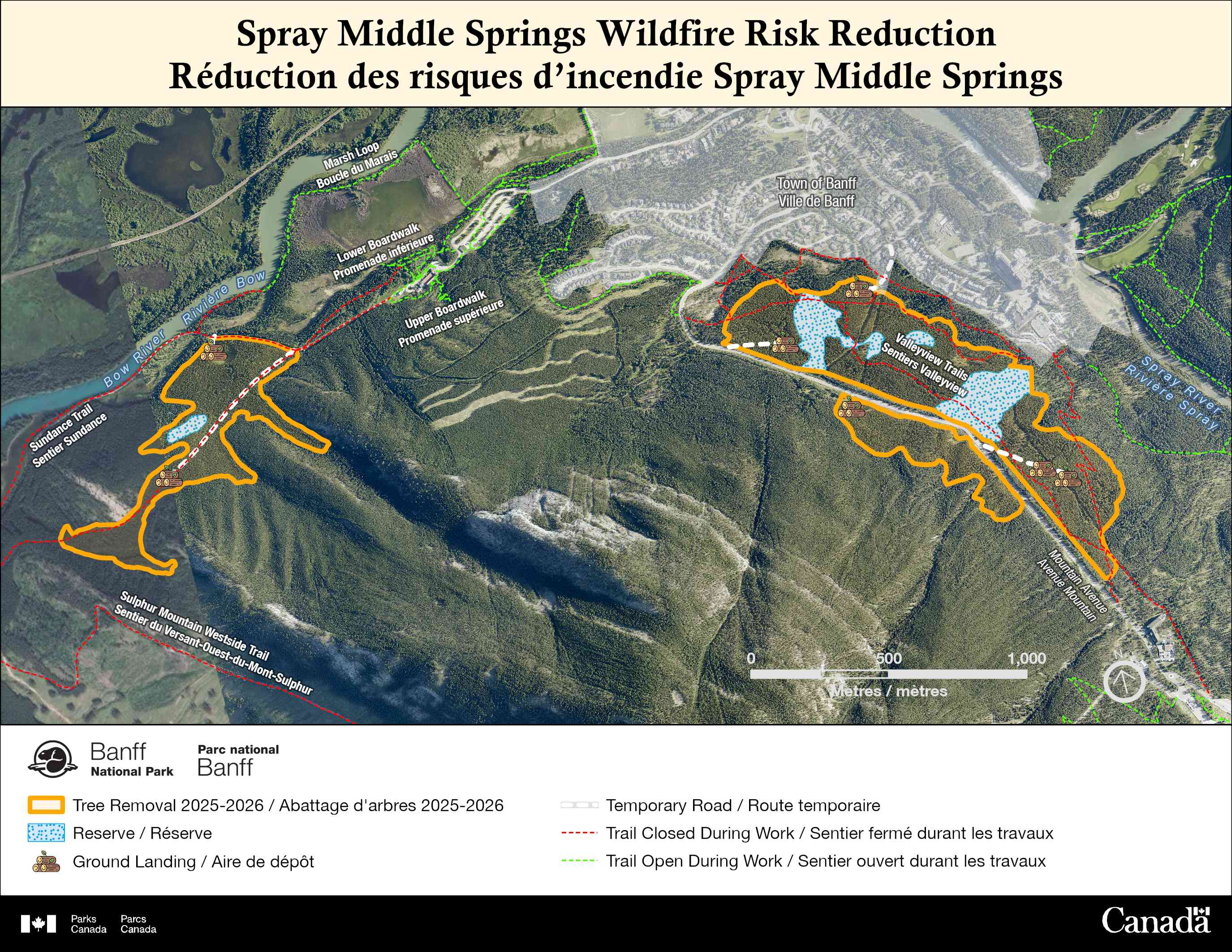 - Area closures: The Spray– Middle Spring Wildfire Risk Reduction Project work will only be occurring on Parks Canada lands, and contractors will take care to not enter residential or commercial property. For the safety of the public and contractors in the project area, area closures will be put in place for the duration of the Spray Middle Springs Wildfire Risk Reduction Project. This includes all trails in the closed areas. Residents and visitors must not attempt to access the closed area for safety reasons. Violators may be charged under the Canada National Parks Act: maximum penalty $25 000. For a complete list of up-to-date closures in Banff National Park please visit: www.parks.canada.ca/pn-np/ab/banff/bulletins.