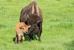 I'm here with Jonathan who is one of our amazing parks staff, he's an ecologist and we've got some pretty cool things behind us, so Jonathan what's going here? [Jonathan] Well this is a great big herd of plains bison, they're calving right now, so we've got a mix of cow bison and the little red calves
