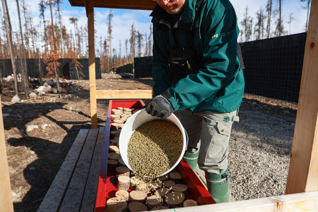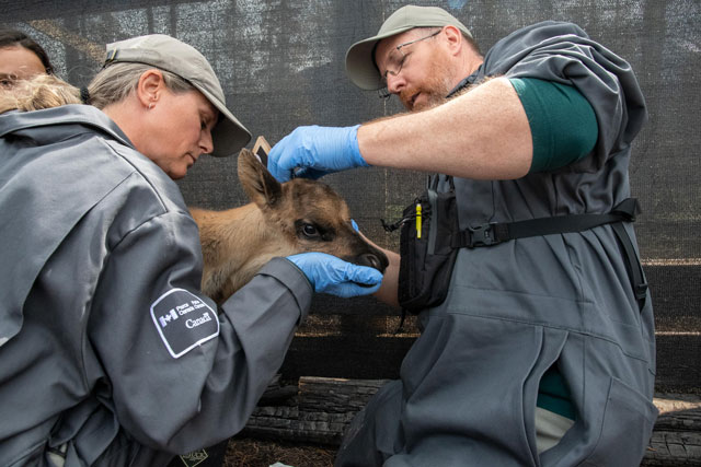 Together with a breeding centre manager, a wildlife health technologist oversees basic day-to-day veterinary care for caribou. The team is guided by a Parks Canada wildlife veterinarian dedicated to the program. Three other wildlife care technicians and maintenance staff are on site to provide animal care, including feeding, monitoring and cleaning.