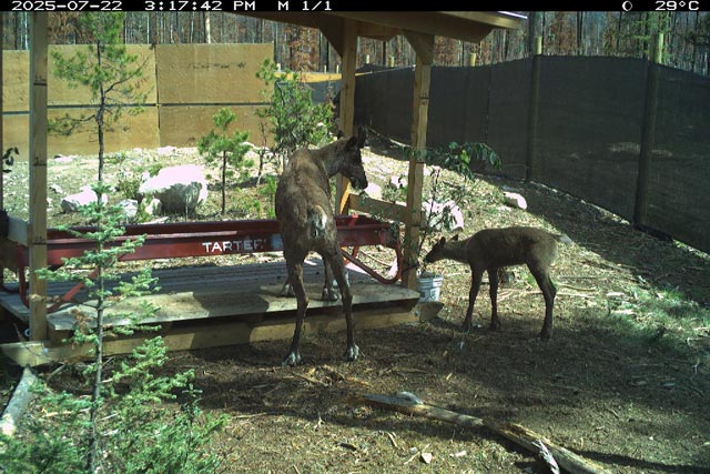 One of the features that made this location suitable was the forest and healthy understory. However, much of that forest was burned in the 2024 Jasper Wildfire. Shade shelters and cooling stations with water sprinklers have been added to keep the caribou cool in summer. Shelters and sprinklers have been used successfully in zoos and other breeding operations.