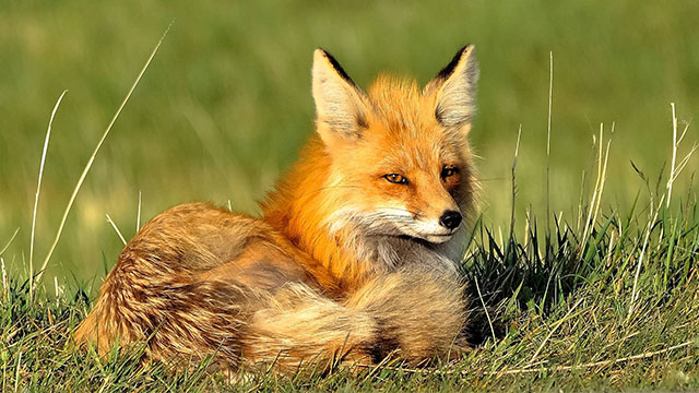 Red foxes are small animals that look like dogs and are mostly active at night. Although they are called red foxes, they don’t always have red fur. Some are black, silver, or a mix called “cross,” a reddish-brown with a dark line across their back and shoulders. Most red foxes have white bellies, black ears, and black legs. They also have long, bushy tails that can be almost half the length of their bodies. Red foxes are slim and have long legs, weighing up to almost 14 kilograms (30 pounds).