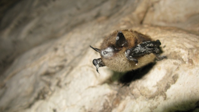 It is an invasive fungal disease that infects bats during hibernation, causing them to wake often and use up the energy they need to survive the winter. Bats may also leave their hibernaculum too early and starve, or freeze to death outside. The fungus appears as a white powder on the bat’s nose, ears, and wings.