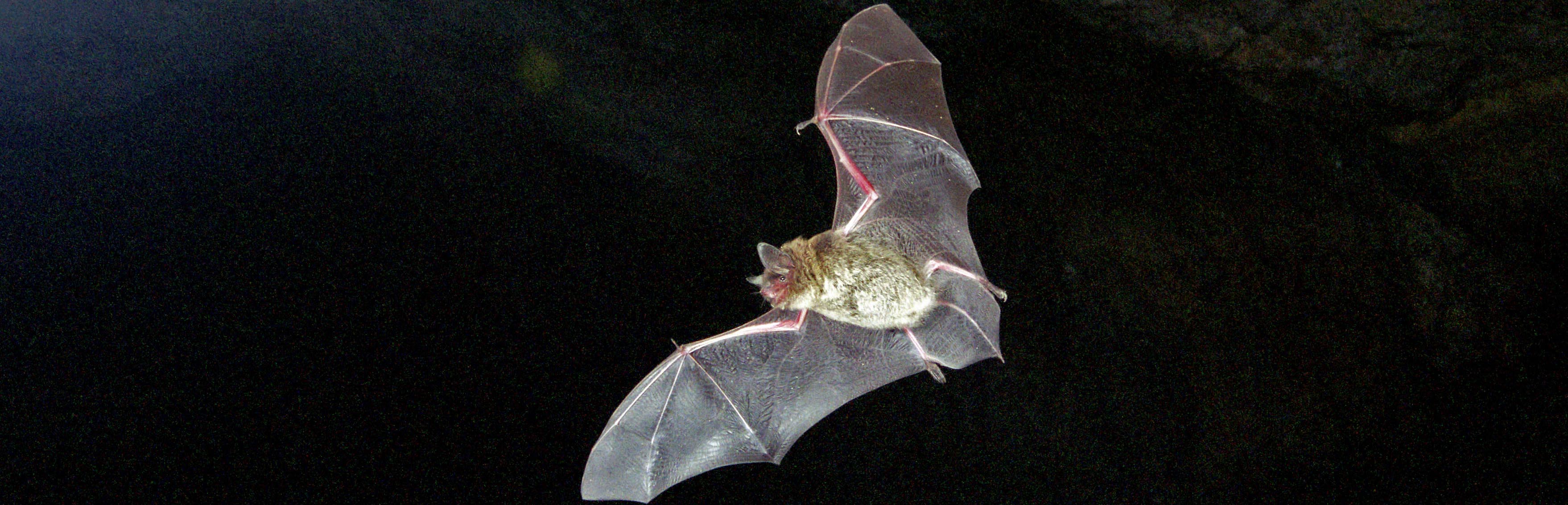 The little brown bat is also called little brown myotis. The word “myotis” means “mouse-eared,” and refers to its relatively small, mouse-like ears. Little brown bats are one of the most well-known bat species in Canada. They like to roost in buildings and are often seen flying at night, catching insects over lakes and around streetlights.
