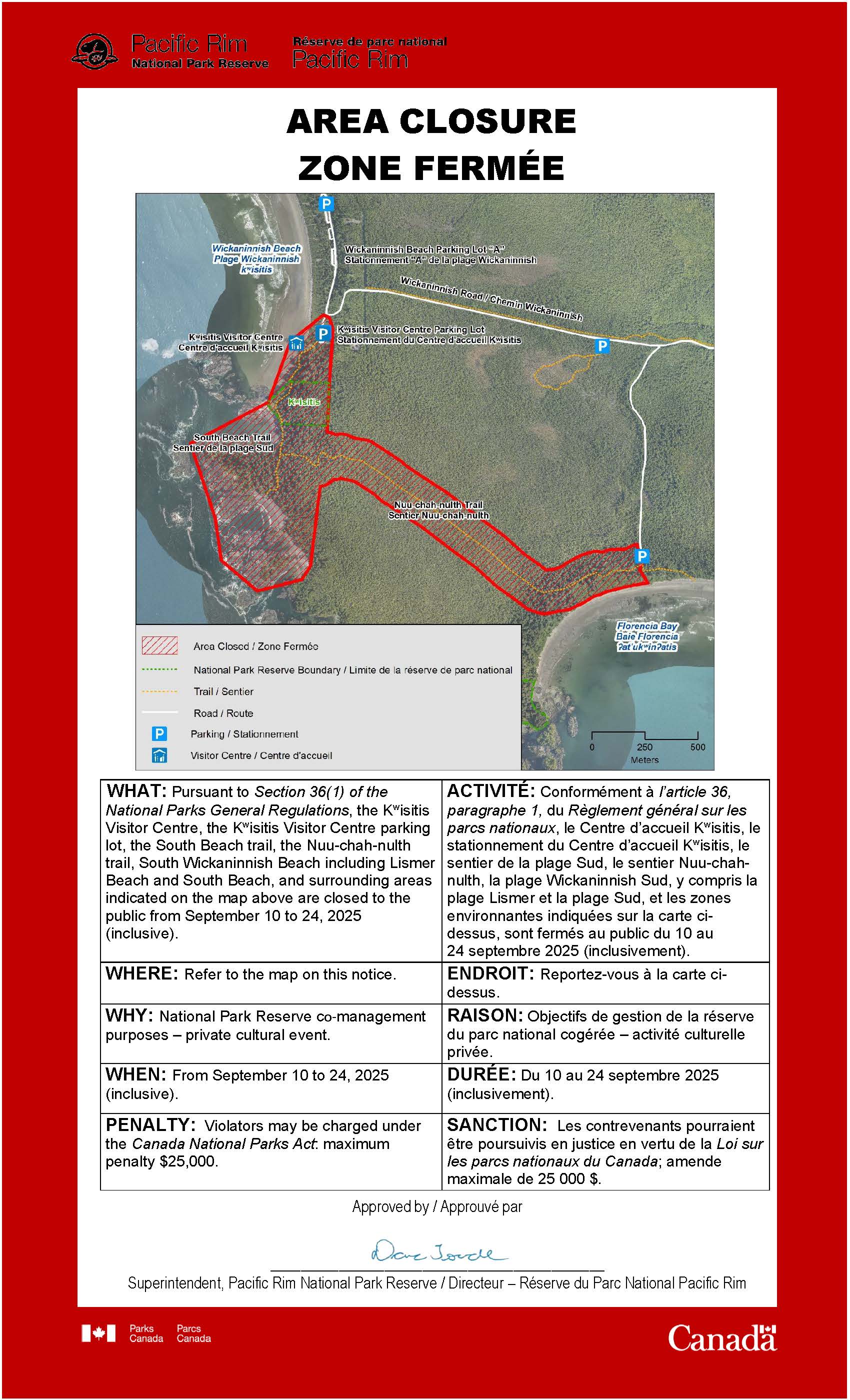 WHAT: Pursuant to Section 36(1) of the National Parks General Regulations, the Kʷisitis Visitor Centre, the Kʷisitis Visitor Centre parking lot, the South Beach trail, the Nuu-chah-nulth trail, South Wickaninnish Beach including Lismer Beach and South Beach, and surrounding areas indicated on the map above are closed to the public from September 10 to 24, 2025 (inclusive).