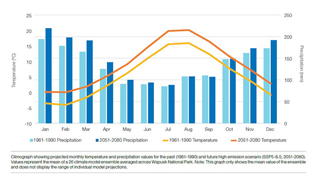 Within Wapusk National Park, total annual precipitation is projected to increase. However, changes in precipitation are not consistent across seasons, with the greatest increase occurring in the winter months and relatively no change in summer precipitation. Models also project an increase in precipitation extremes (e.g. heavy precipitation events) over that same time period. For example, the maximum amount of rainfall over a 5-day period is expected to increase by 18% under a high-emission scenario, relative to the recent past. Seasonal changes in temperature and precipitation (see the Climograph,) will likely combine to affect snowpack depth and duration, permafrost thaw, stream flows and wetland and lake levels. For example, rising winter temperatures can cause more precipitation to fall as rain rather than snow and shift the timing, duration, and magnitude of peak stream flows in spring.