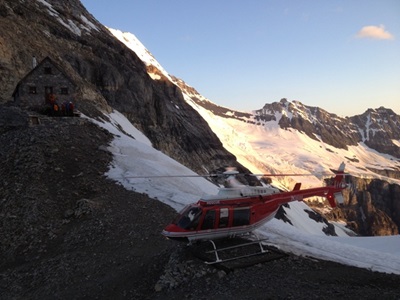 The Alpine rescue helicopter in early morning light at Abbott’s Pass.