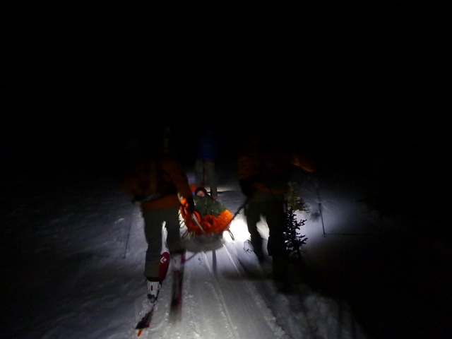 Parks VS Specialists with the help of a Yamnuska mountain guide transport the injured snowboarder back to Skoki during the night.