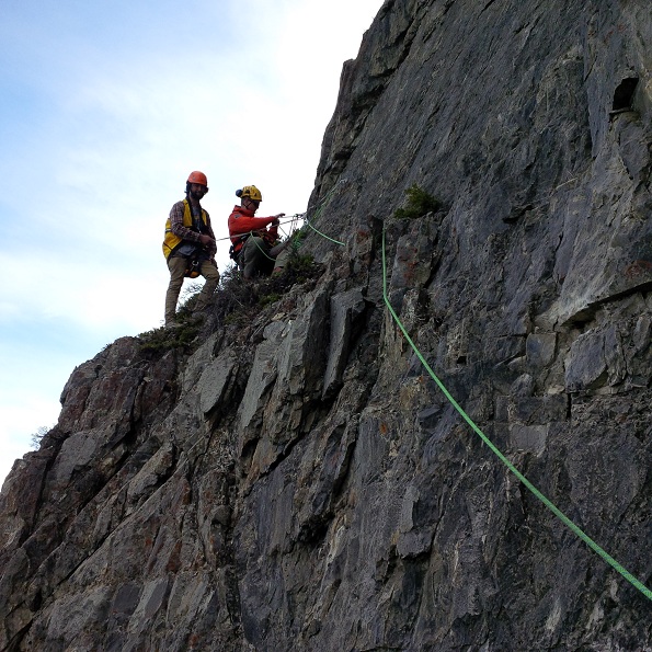 Three VS Specialists got on board and assessed the scene from the helicopter. They decided that the best way to access the site would be to heli-sling into a small ledge ~10m above and to the left of the stranded scrambler. The ledge was small enough that they didn’t feel comfortable disconnecting from the heli-sling line without anchoring into the wall, so the first rescuer slung into the site and drilled a bolt while remaining clipped into the line. Once the bolt was drilled, the first rescuer clipped into the bolt and unclipped from the helicopter. Next, the first rescuer prepared a two bolt anchor to receive the second rescuer.