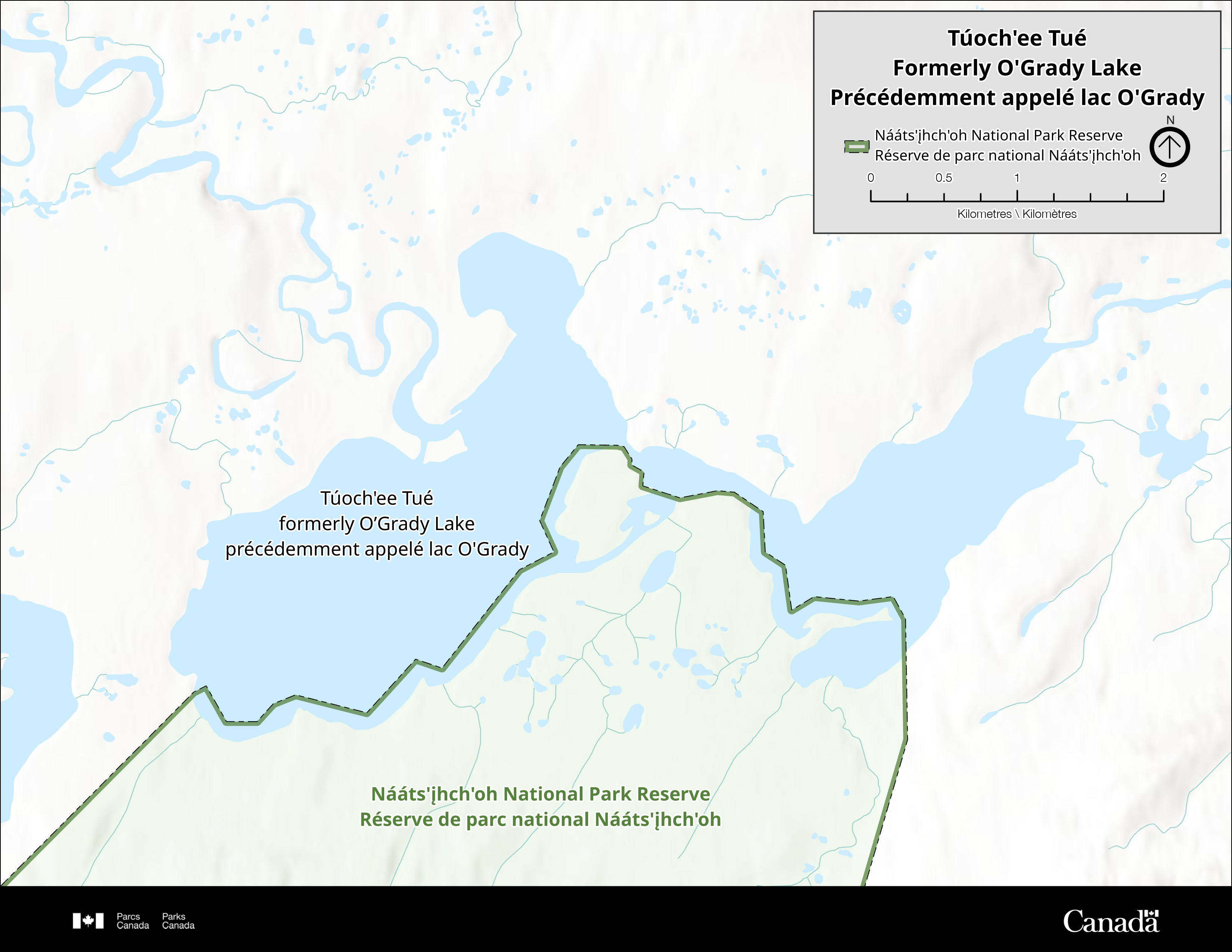 If you are paddling Túoch'ee Deé (the Natla River) please be aware that part of Túoch'ee Tué (formerly O’Grady Lake) is in Nááts’įhch’oh National Park Reserve. Registration is required if you are landing or camping in the national park reserve.