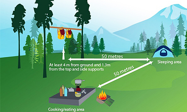 Minimize bear encounters in camp by managing your food, garbage and associated odours. Follow the recommended ‘safety triangle’ when setting up your campsite in the backcountry (see diagram below).