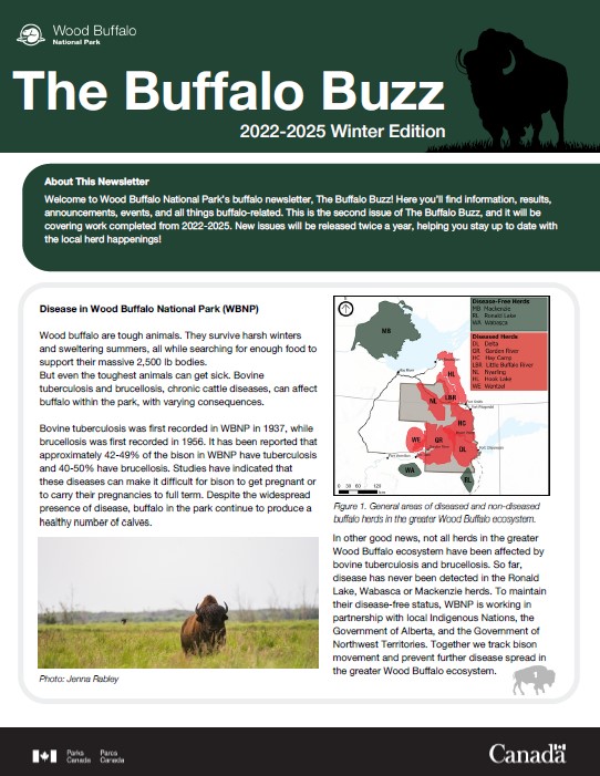 Welcome to Wood Buffalo National Park’s buffalo newsletter, The Buffalo Buzz! Here you’ll find information, results, announcements, events, and all things buffalo-related. This is the second issue of The Buffalo Buzz, and it will be covering work completed from 2022-2025. New issues will be released twice a year, helping you stay up to date with the local herd happenings!