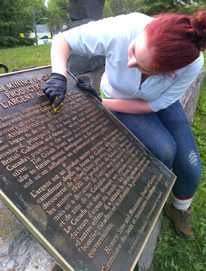 Nicole sanding the letters to remove tarnish© Parks Canada