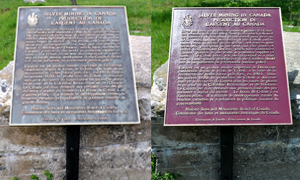 BEFORE – Silver Mining plaque tarnished and weathered. AFTER – Silver Mining plaque painted and polished. © Parks Canada
