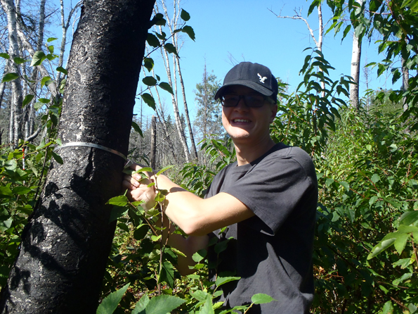 Lakehead University student measures tree diameter in a fire monitoring plot © Parks Canada