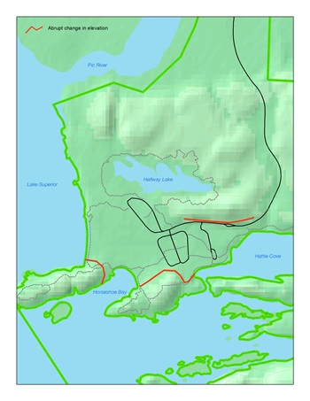 Map showing areas with abrupt elevation changes to avoid, when trying to force a bear out of the Hattie Cove Campground