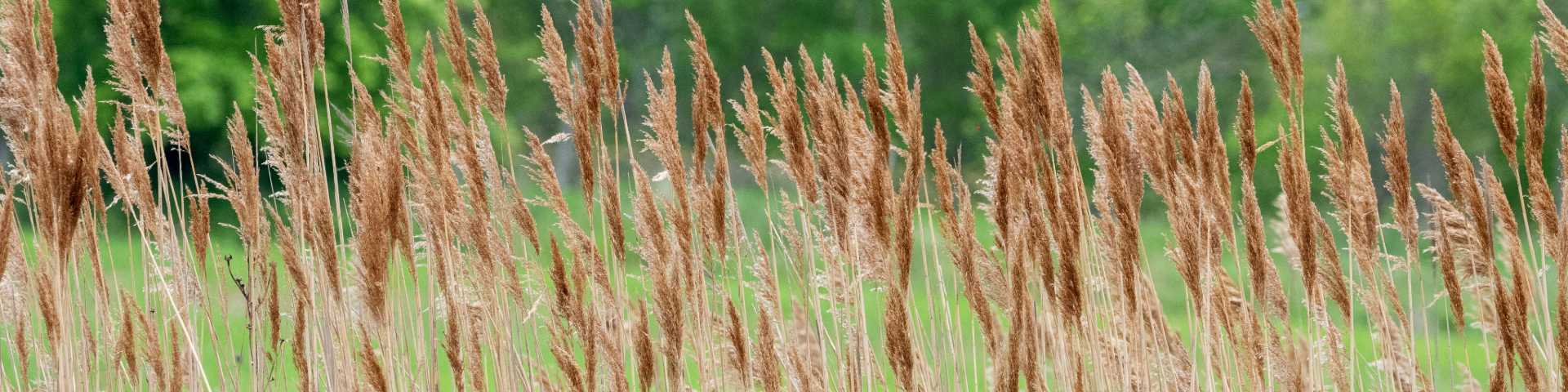 Invasive Phragmites is a perennial grass native to Eurasia that grows around wetlands and beaches. It forms dense stands, reaching heights of up to 5 metres, and spreads aggressively, crowding out native vegetation and reducing plant biodiversity. It releases toxins from its roots to hinder the growth of surrounding plants, helping it to take over an area. Compared to native wetland plant communities, stands of invasive Phragmites offer poor habitat and food for wildlife.