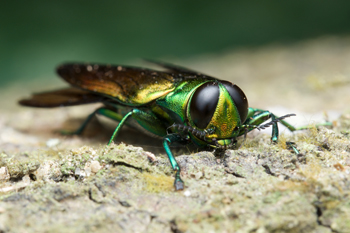 The emerald ash borer is a beetle native to Asia that has attacked and killed millions of ash trees in North America. It was first detected in Canada in 2002 and is believed to have been accidentally introduced through wooden packaging material. The beetles lay their eggs on ash trees and the larvae chew through the bark and feed on the tree's water and nutrient transport system, killing it. The range of the emerald ash borer is rapidly expanding due to the movement of infested materials. Help stop the spread of this destructive species by not transporting infested wood and burning firewood where you obtain it.
