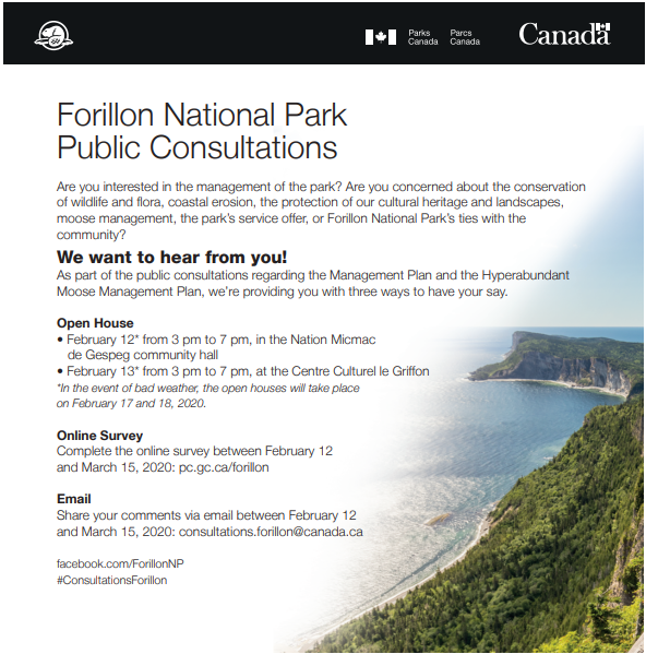 ["Parks Canada invites the population to participate in public consultations as part of the renewal of the Management Plan of Forillon National Park, and also for the elaboration on the Management Plan on the overabundant moose population."] |