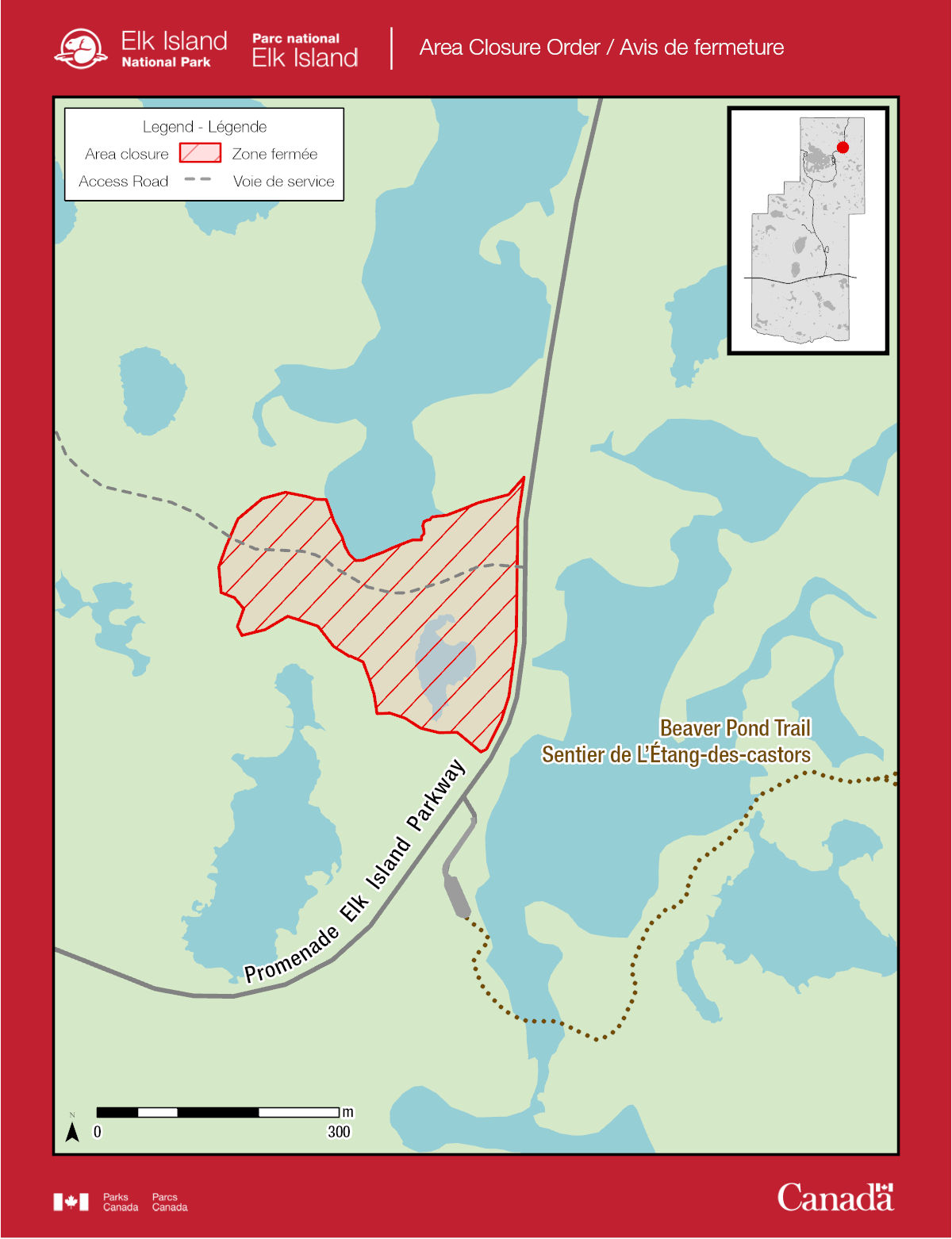 Small areas within the National Park may be closed, as needed, to prevent park visitors from entering into sites where there is an elevated risk of negative interactions with wildlife, or where wildlife capture activities are being undertaken for the purpose of park management. Closed areas will be clearly marked in the field for the duration of the closure, however no additional information will be posted on Parks Canada websites.
