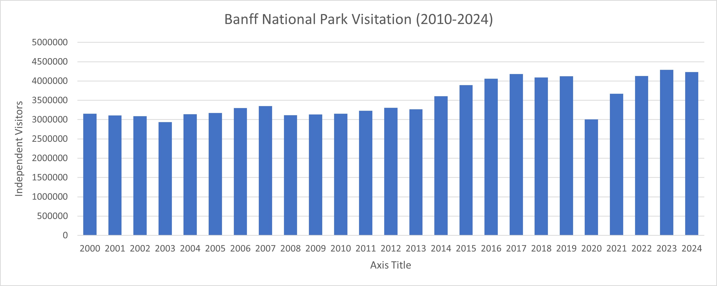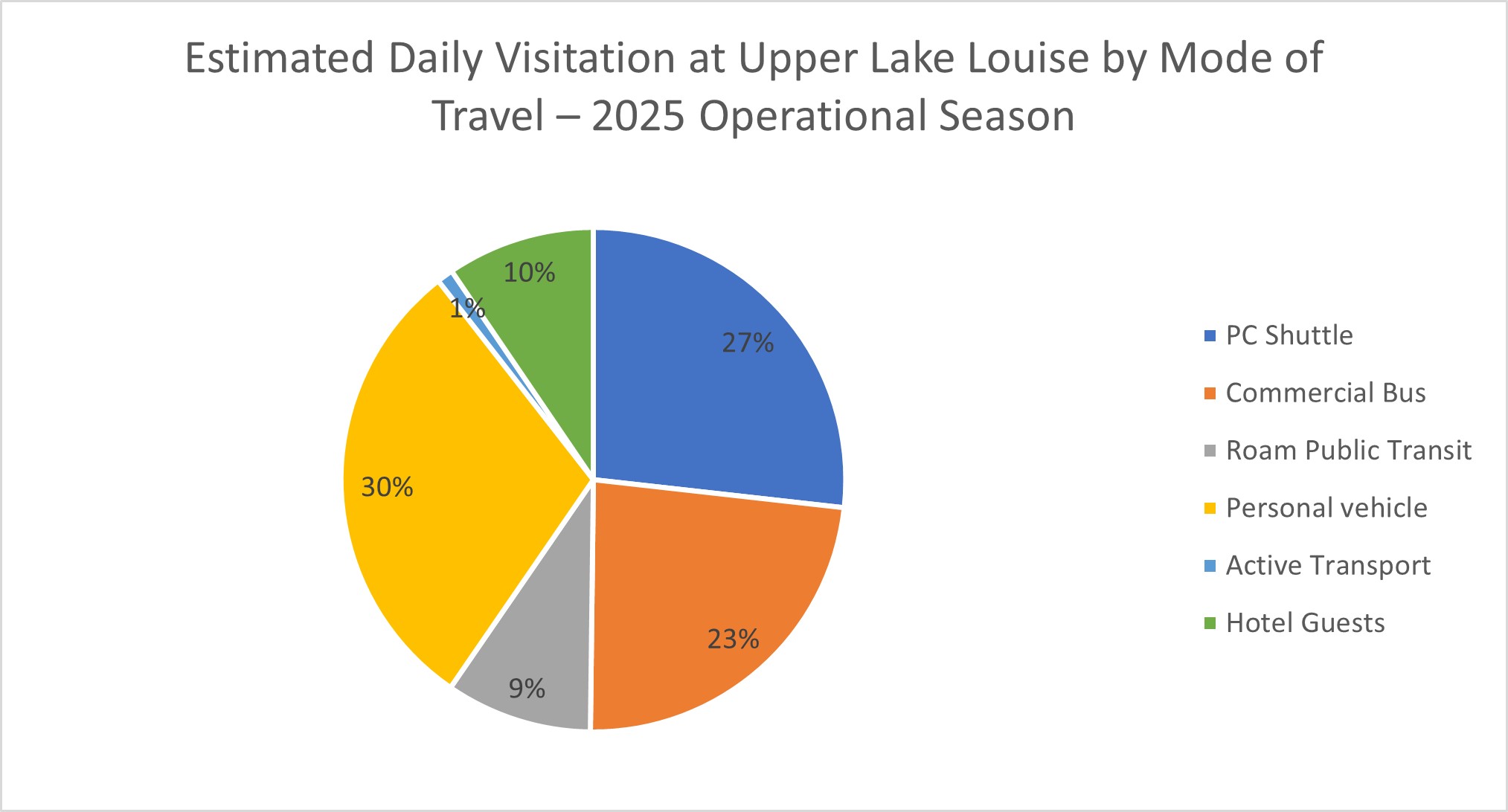 - The Upper Lake Louise area saw approximately 11 000 daily visitors during the 2025 operating season, up from 9 000 daily visitors in 2023. However, accuracy of commercial use at Upper Lake Louise is limited to observations and estimates, so this number could vary.
