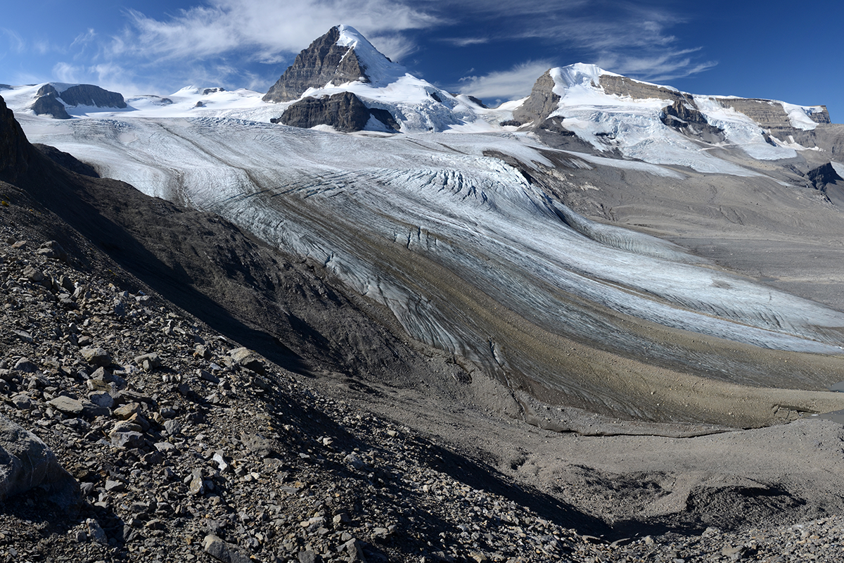 | Robson Glacier | Mount Robson is just west of the park, but its large glacier complex straddles the continental divide and provides some of the headwaters for the Smoky River: a river that travels north to the Peace River and eventually Great Slave Lake. |