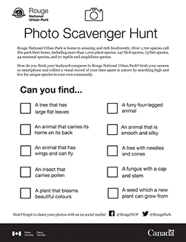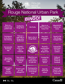 Are you an expert RNUP explorer? See how many squares can you get on this Rouge National Urban Park Bingo card. Don’t forget to share your results online!