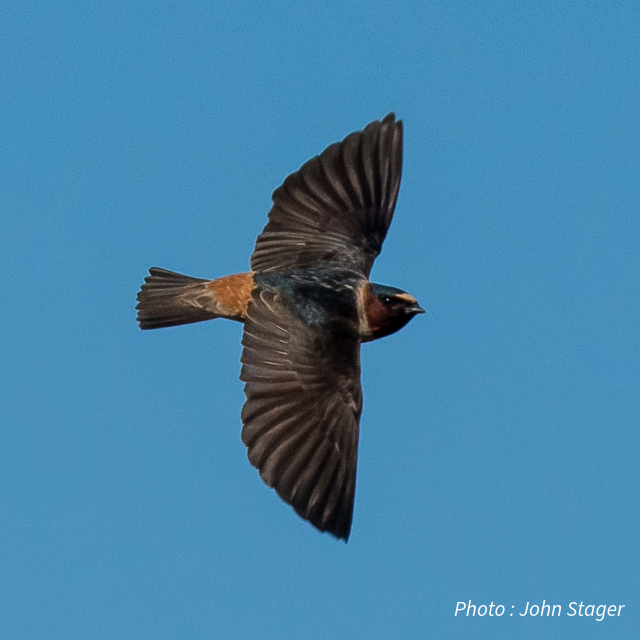 Appearance: Cliff swallows are small, square-tailed songbirds with cream-coloured bellies, dark blue backs, rust-coloured throats and a distinct pale patch on their forehead.